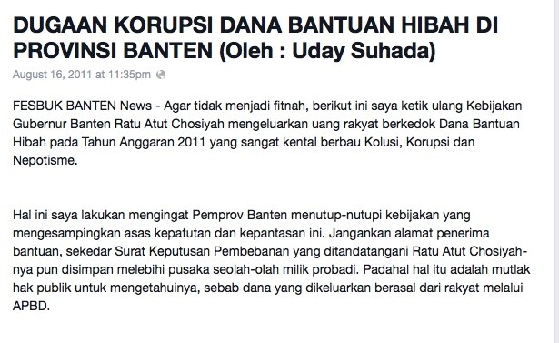 One anti-corruption activist in Banten told me that ordinary citizens feel corruption is a complex issue. But poor infrastructure, especially roads, is something they find easy to comprehend, as this is a ‘concrete’ way to witness the presence of corruption and really feel it. However, more complex allegations also appear on FBN. One example is the so-called ‘social assistance grant corruption case’, or Kasus Dana Hibah, which absorbed the public’s attention from 2011 to 2014. The suspicion was that large amounts of money from this fund, which was supposed to help the poor in Banten, had been redirected to pay for Ratu Atut’s gubernatorial election campaign in 2011. One of the most detailed FBN reports on this case was written by Uday Suhada, a well-known Banten anti-corruption activist belonging to Aliansi Independen Peduli Publik, or the Independent Alliance for Public Care (ALIPP).